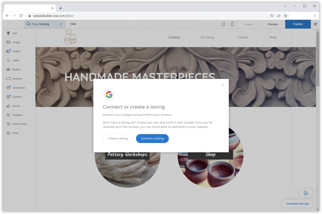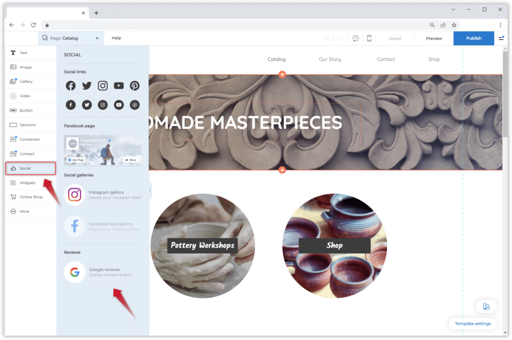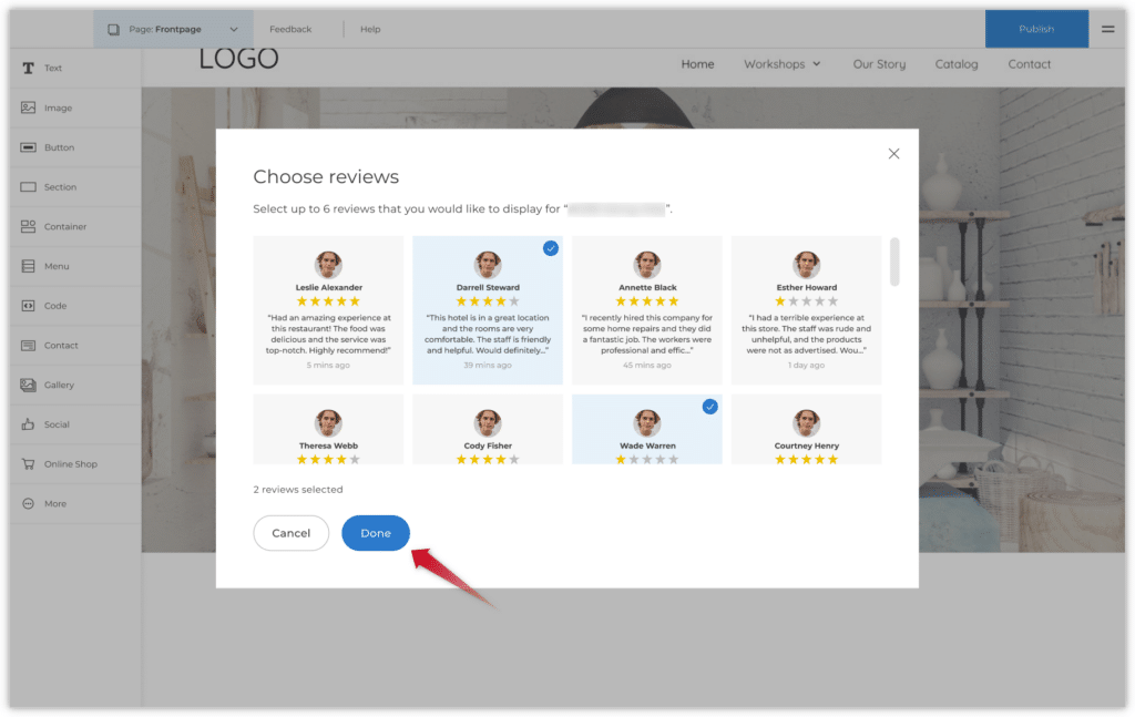 - Vieritä alas kohtaan Arvostelut ja napsauta Google-arvostelut -widgettiä. Voit myös vetää komponentin työtilaasi.