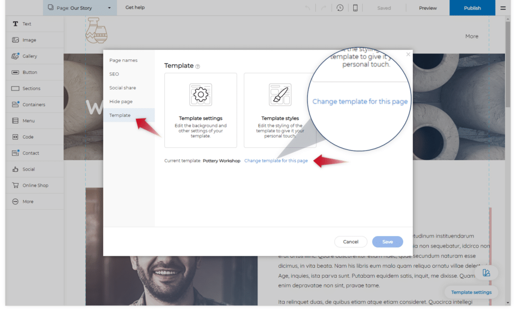 - Napsauta Vaihda tämän sivun malli kahden mallivalintaruudun alta.
