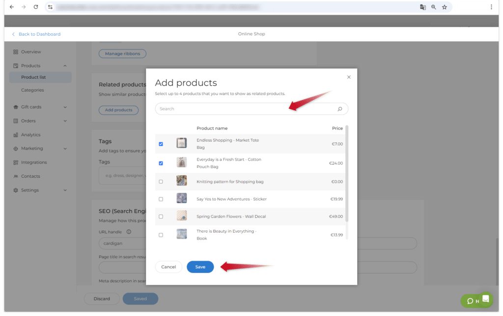 5. Valitse enintään neljä tuotetta, jotka haluat näyttää tuotteen yhteydessä.