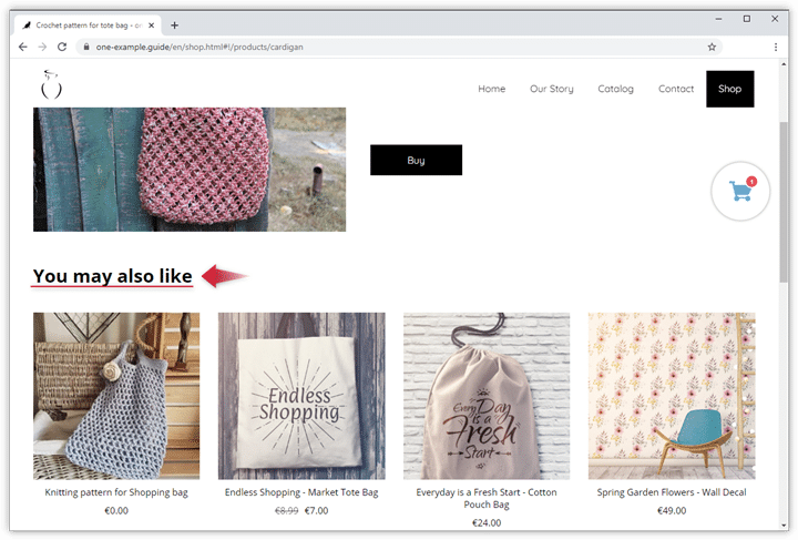 Kun liittyvät tuotteet on otettu käyttöön, ne näkyvät verkkokaupassa suoraan tuotteen alla sillä otsikolla, jonka määritit ”Valikoiman otsikoksi”.