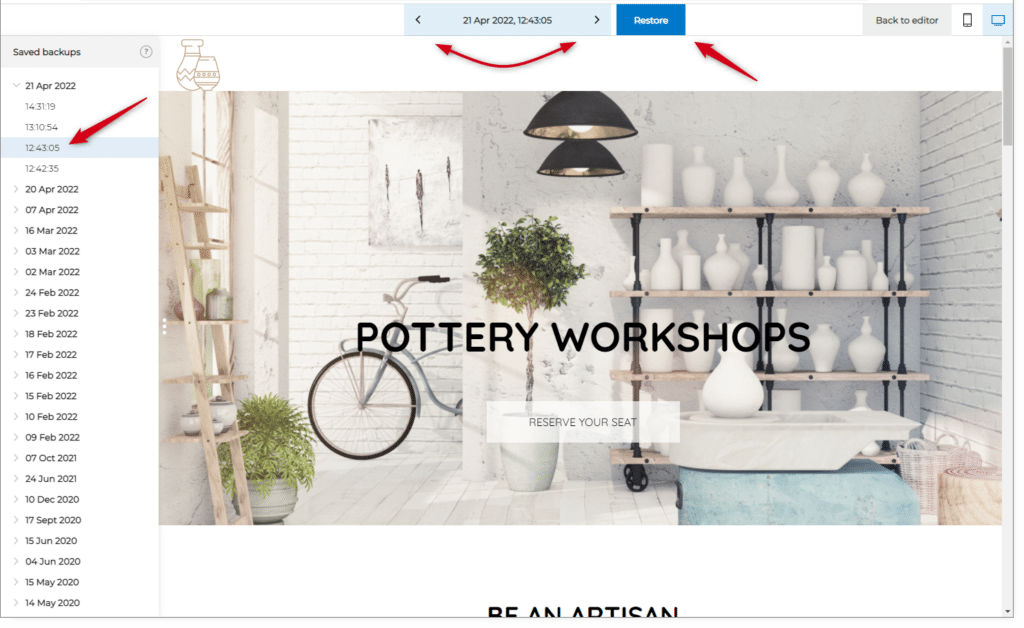 3. Kun olet löytänyt version, jonka haluat palauttaa, napsauta Palauta varmuuskopio näytön ylälaidassa.