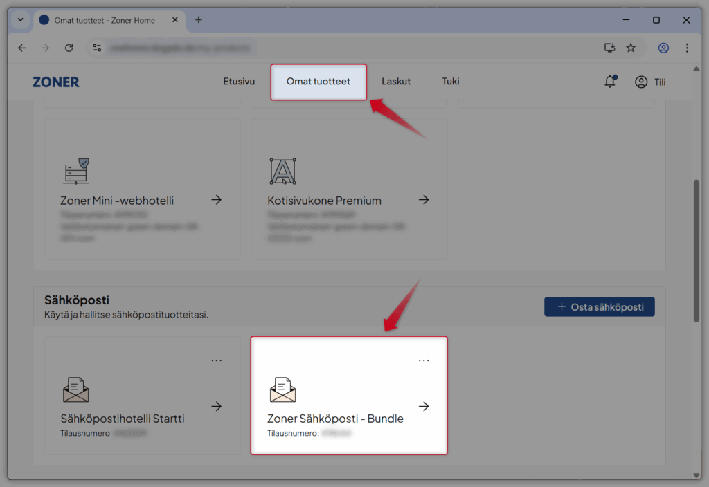 - Mene Omat tuotteet -sivulle ja klikkaa Sähköposti-osiossa tuotetta ”Zoner Sähköposti – Bundle”.
