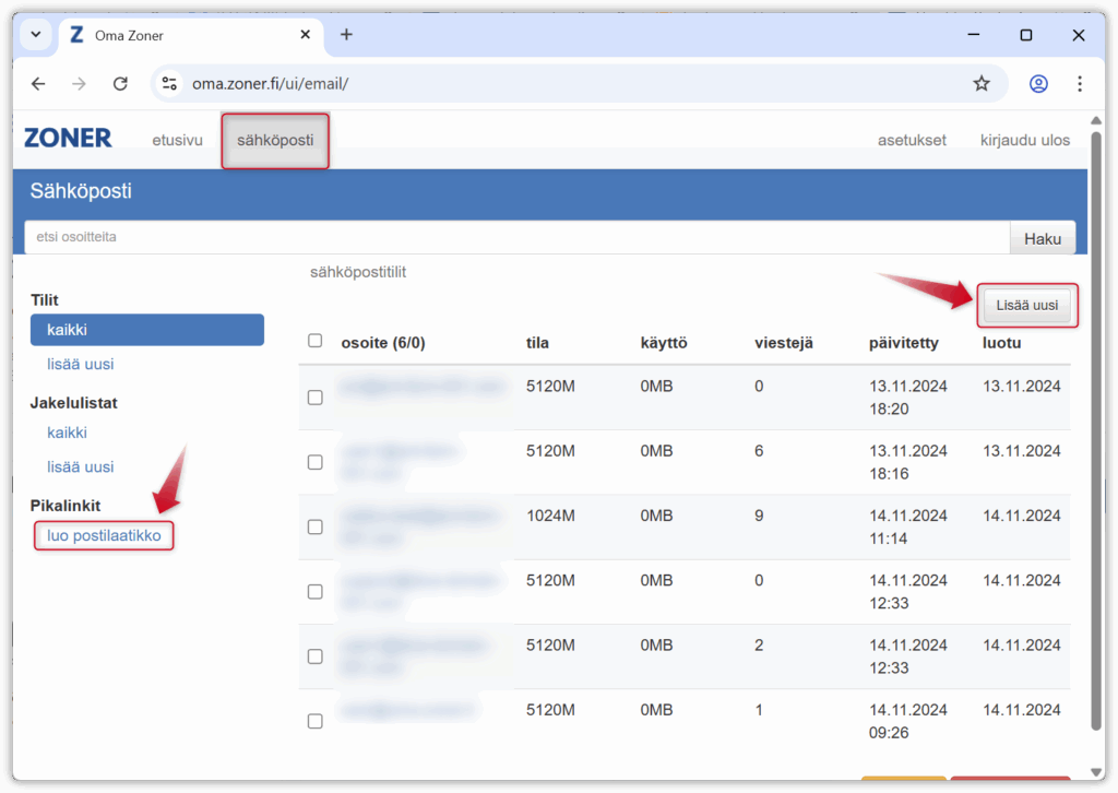 3. Sähköpostin hallinta avautuu uudelle välilehdelle. Näet listan luomistasi sähköpostilaatikoista, kun klikkaat ylävalikossa sähköposti. Luo uusi sähköpostilaatikko klikkaamalla vasemmassa valikossa luo postilaatikko tai listan yläpuolella Lisää uusi.