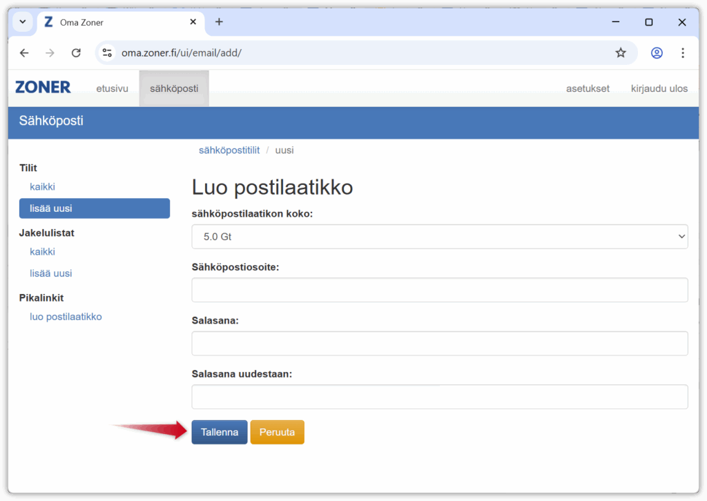 4. Syötä kenttään haluamasi sähköpostiosoite ja anna sille salasana. Klikkaa lopuksi Tallenna.