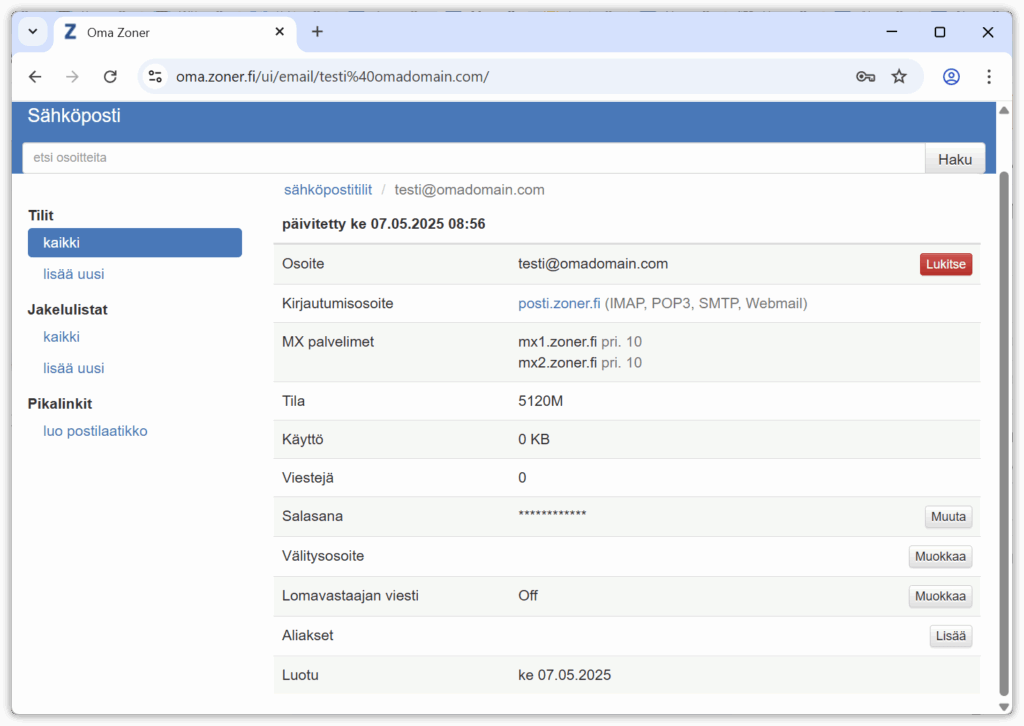 4. Seuraavalla sivulla näet luomasi sähköpostilaatikon tiedot. Voit määrittä lomavastaajan tai välitysosoitteen klikkaamalla rivin oikeassa reunassa Muokkaa ja luoda aliaksia klikkaamalla Lisää.