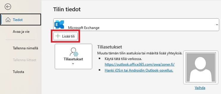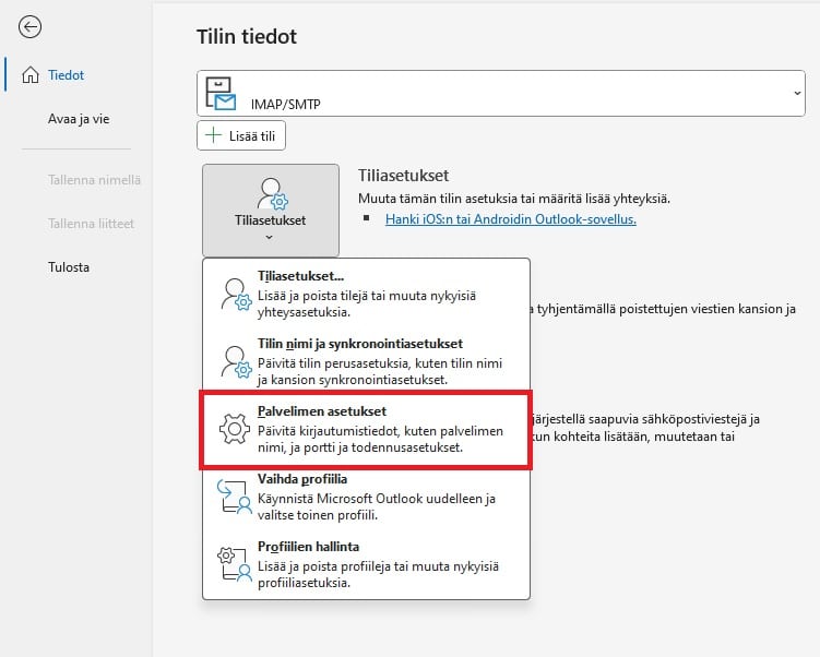 Mikäli tili on jo lisättynä Outlookkiin: Ohjeen 1. vaiheen ”Tiedosto” -painikkeen jälkeen ilmestyvältä sivulta pääsee määrittämään olemassa olevien käyttäjien palvelinasetuksia ”Tiliasetukset”, ”Palvelimen asetukset” -kautta.