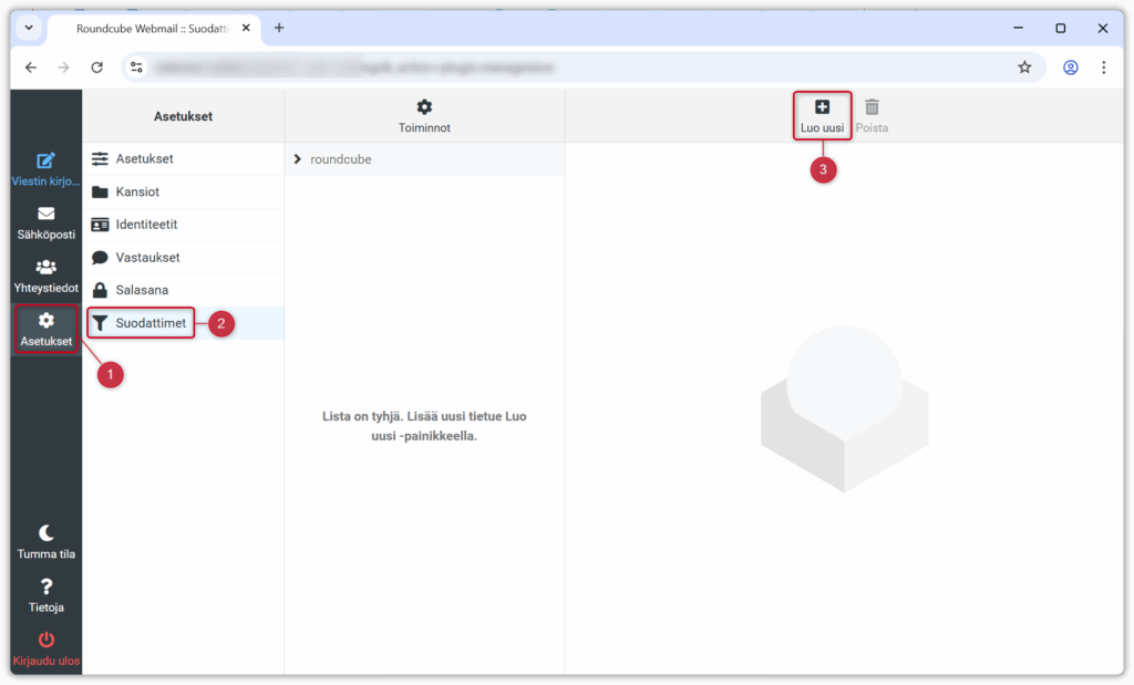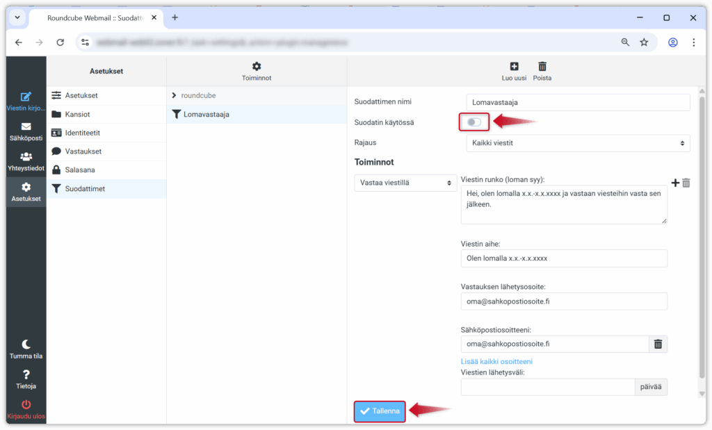 Roundcube-webmailissa voit luoda automaattisen vastauksen myös suodattimien avulla, jos varsinainen Lomavastaaja-ominaisuus ei ole käytössäsi.