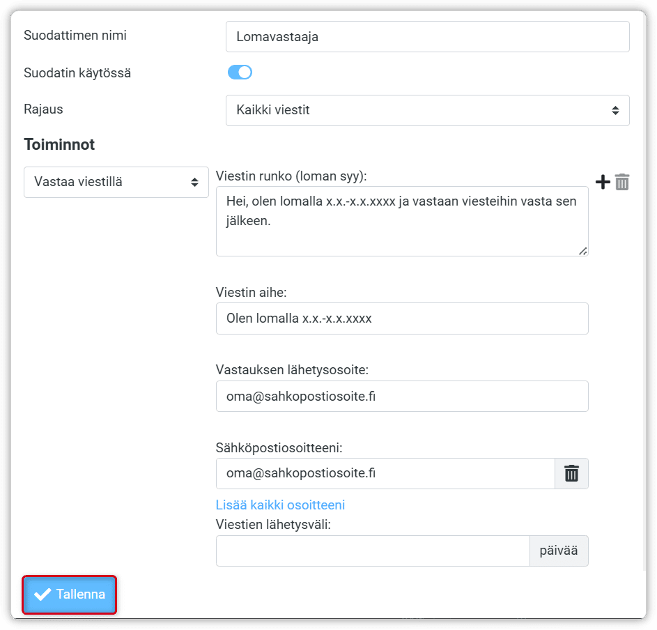 - Viestin runko: Kirjoita tähän automaattisen vastauksen viesti.