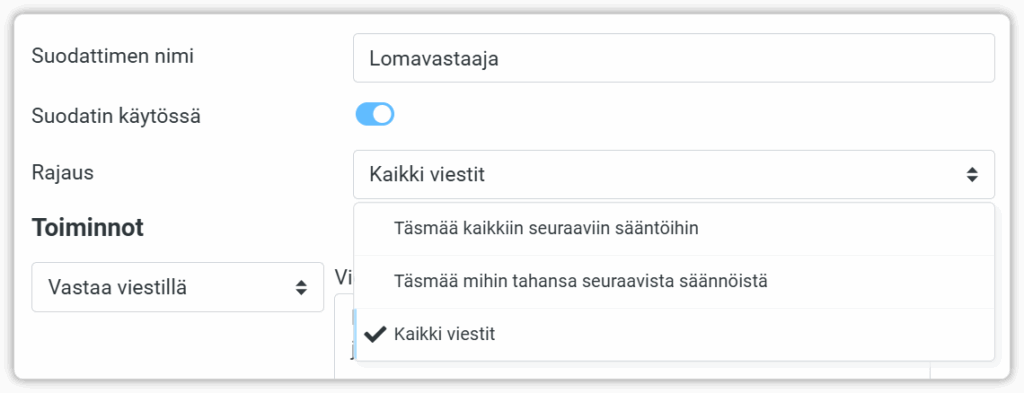 5. Toiminnot-kohdassa voit määrittää, mitä tapahtuu, kun suodatin aktivoituu.