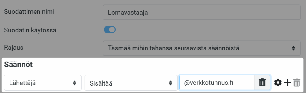 4. Jos et valinnut Rajaus-kohdassa ”Kaikki viestit”, voit määrittää Säännöt-kohdassa suodattimelle ehtoja. Esimerkiksi alla olevassa kuvassa on määritetty, että suodatinta sovelletaan vain sähköposteihin, jotka on lähetetty @verkkotunnus.fi-päättyvistä osoitteista.