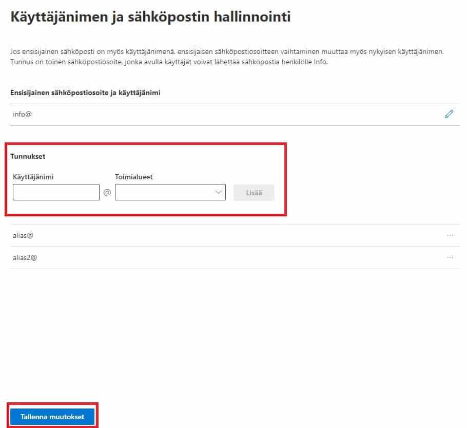 6. Kun olet saanut lisättyä halutut aliasosoitteet, paina Tallenna muutokset.