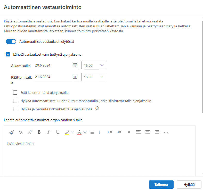 - Lisää kenttään Lähetä automaattivastaukset organisaation sisällä automaattivastaus, jonka organisaatiossasi työskentelevät henkilöt saavat.