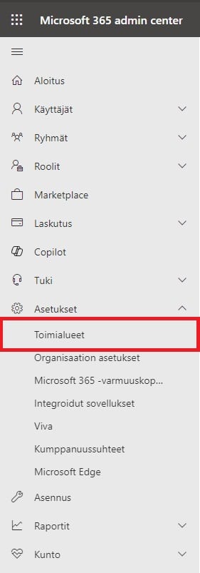 - Valitse vasemman valikon Asetukset -kohdan alta Toimialueet.