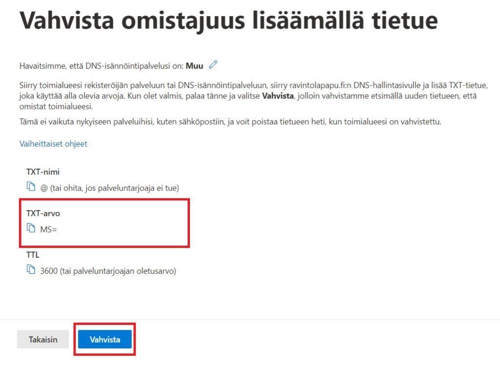 8. Lisää verkkotunnuksesi DNS-hallinnasta palvelun antama uniikki TXT-vahvistustietue.