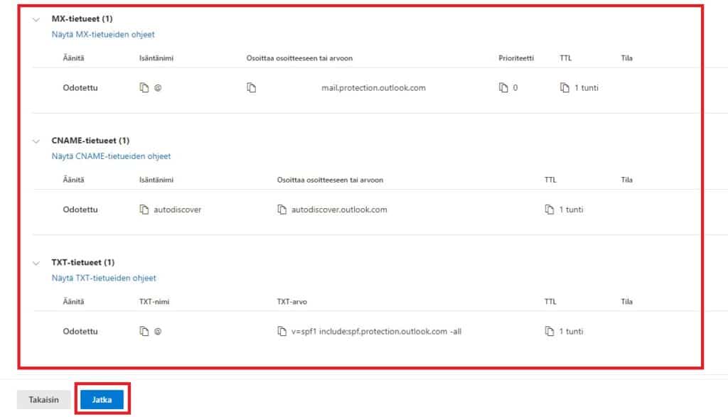 10. Kun tietueen lisäyksen jälkeen vahvistaminen menee läpi, lisää palvelun antamat muut tietueet verkkotunnuksen sähköpostien ohjaamiseksi palveluun ja paina Jatka.