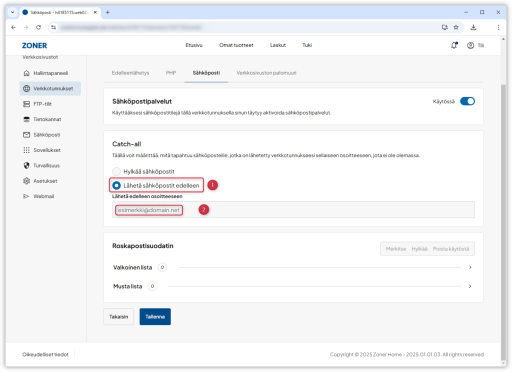 Valitettavasti suurin osa catch-all-osoitteen vastaanottamasta sähköpostista on kuitenkin roskapostia. Jos päätät käyttää catch-all-toimintoa, suosittelemme, että luot omalla verkkotunnuksellasi erillisen tilin sitä varten, ja tarkistat välillä, oletko saanut sinne tärkeitä sähköpostiviestejä.