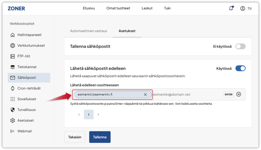 Sähköpostiosoitteen Asetukset-sivulla näkyy joissakin tapauksissa vain ”Lähetä sähköpostit edelleen” -osio. Tässä tapauksessa voit vaihtaa salasanan ”Lähetä edelleen osoitteeseen” -kentässä näkyvän sähköpostiosoitteen asetuksissa. Löydät ne Zoner Homesta yllä kuvatulla tavalla.