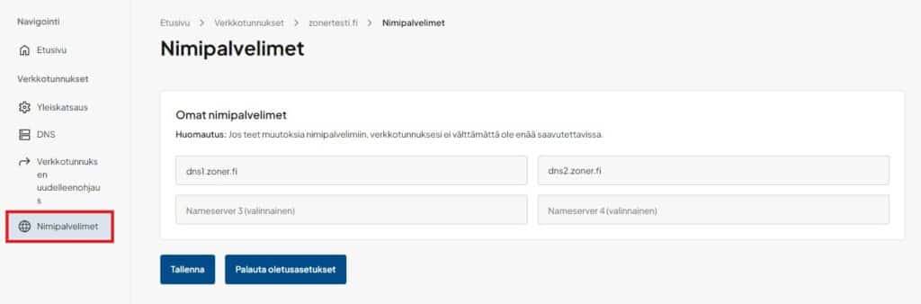 12. Napsauta sitten vasempaan valikkoon ilmestynyttä Nimipalvelimet-kohtaa: