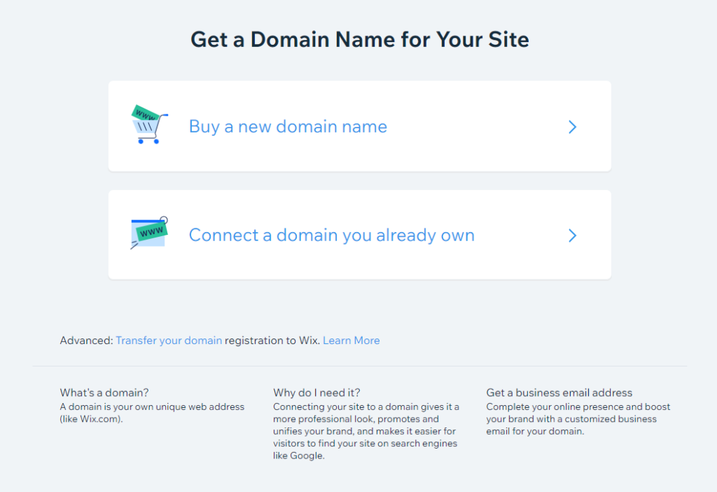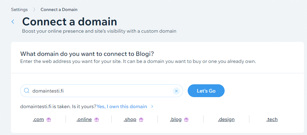 Ennen kuin oma domain voidaan lisätä, täytyy domain eli verkkotunnus olla jo tilattuna. Vapaita verkkotunnuksia voi etsiä ja ostaa domainhaun avulla. Lisäksi tarvitset jonkin Wix Premium -tileistä.