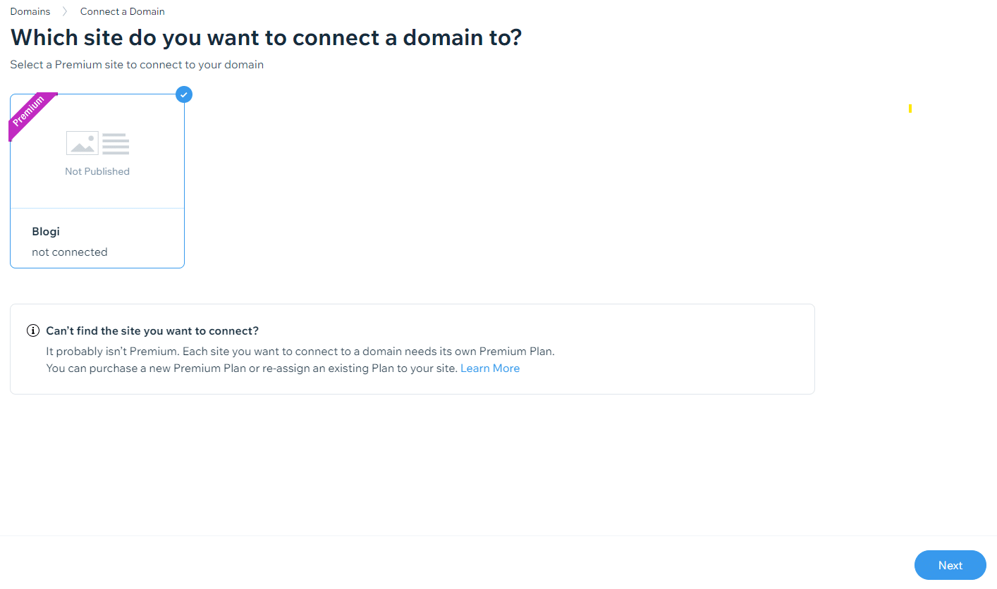 4. Valitse Wix-sivusto, johon haluat yhdistää verkkotunnuksen, ja paina Next.