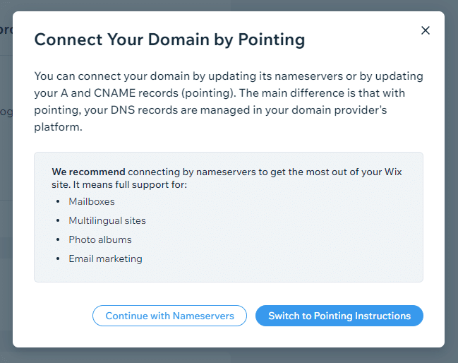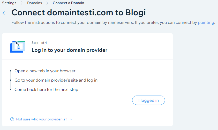 - Seuraavaksi Wix antaa vaiheittaiset ohjeet domainin yhdistämiseen.