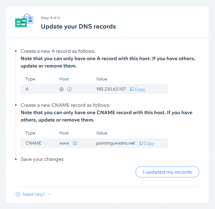 - Napsauta lopuksi Wix-välilehdellä I updated my records.