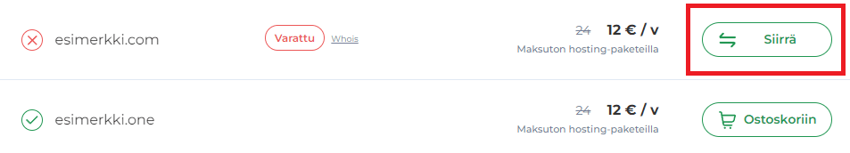 Valitse tilauksen yhteydessä haluttu verkkotunnus verkkotunnushakumme kautta ja valitse varatuille verkkotunnuksille ilmestyvä valinta ”Siirrä”.