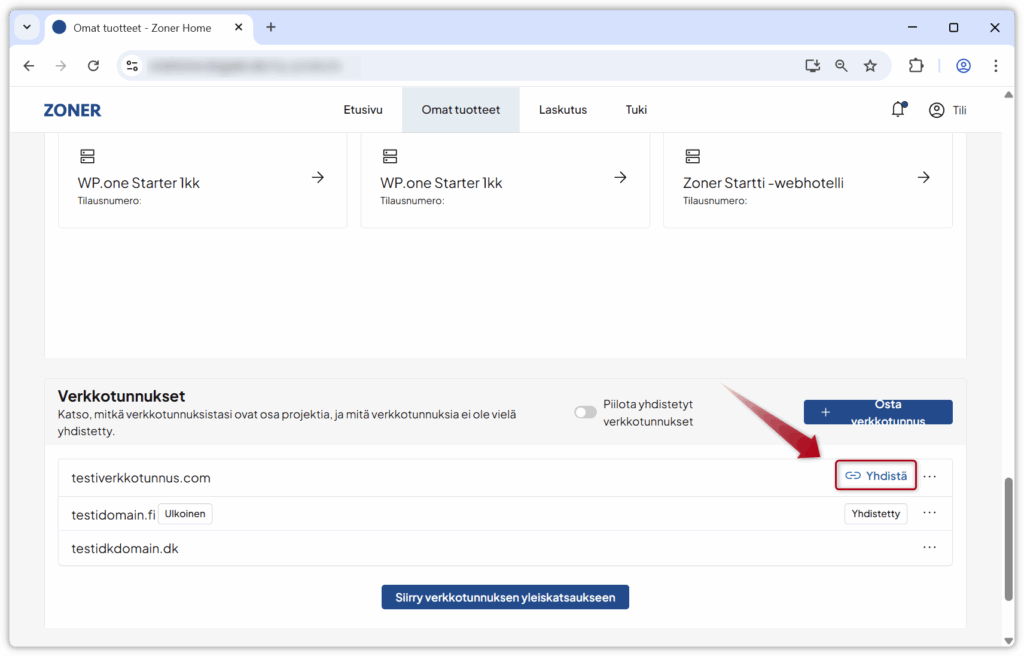 3. Vieritä kohtaan Verkkotunnukset. Klikkaa Yhdistä sen verkkotunnuksen kohdalla, jonka haluat yhdistää webhotelliin.
