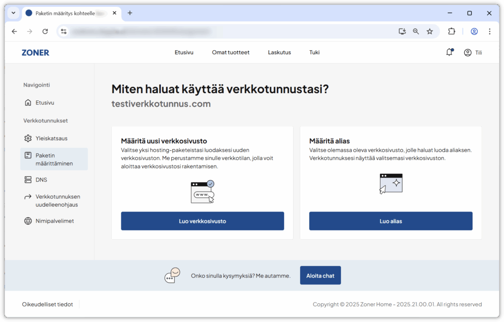 4. Valitse, haluatko luoda verkkotunnukseen uuden sivuston, vai yhdistää sen aliaksena jo olemassa olevaan sivustoon.