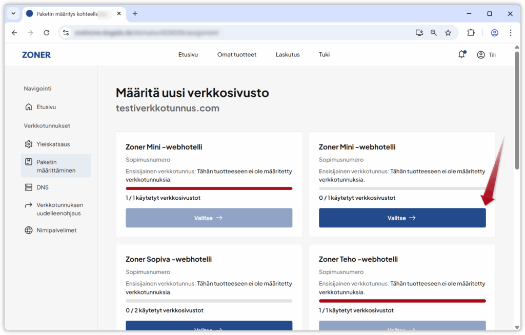 5. Klikkaa Valitse sen webhotellin kohdalla, johon haluat yhdistää verkkotunnuksen.