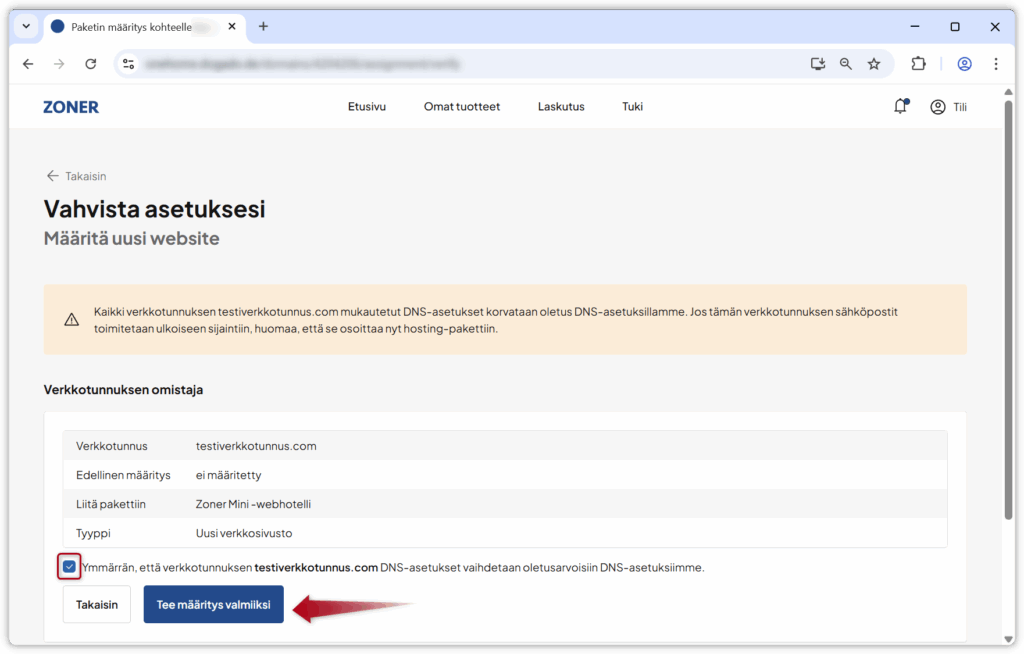 6. Kun verkkotunnus yhdistetään hosting-pakettiin, sen nykyiset DNS-asetukset korvataan Zonerin oletus DNS-asetuksilla. Vahvista rastittamalla valintaruutu ja klikkaamalla Tee määritys valmiiksi.
