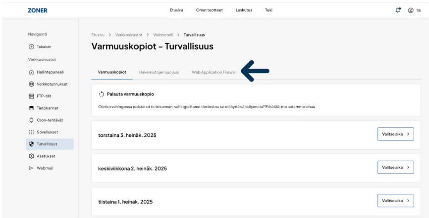 - Napsauta nyt ”Turvallisuus” ja sitten ”Web Application Firewall”.