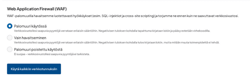 - Voit määrittää WAF:n erikseen jokaiselle verkkotunnukselle ja aliverkkotunnukselle