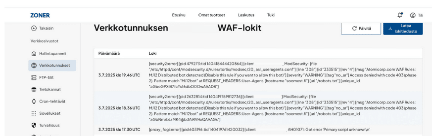 - Verkkosivustosi pääsy tarkistetaan sääntöjen perusteella. Jos sääntöä rikotaan, tapahtuma vain kirjataan lokiin; lisätoimiin ei ryhdytä. Vastaava loki löytyy painikkeen alta. Verkkosivustosi lokit web-hostingissa ja WordPress-hostingissa (oneHome).