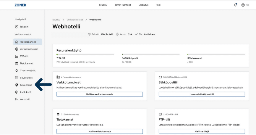 - Pääset Webhotelli -pakettisi hallintaan klikkaamalla ”Omant tuotteet > Verkkosivusi”