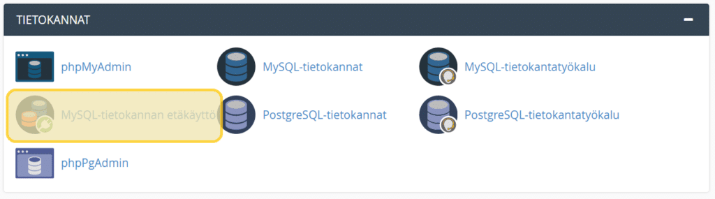 • Valitse Tietokannat-osion alta MySQL-tietokannan etäkäyttö.