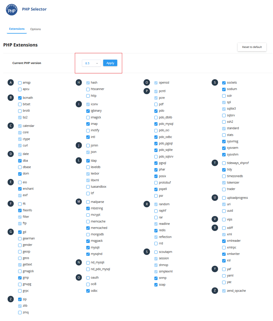 • Valitse alasvetovalikon kautta PHP versio ja mahdolliset lisäosat. Lopuksi paina Apply.