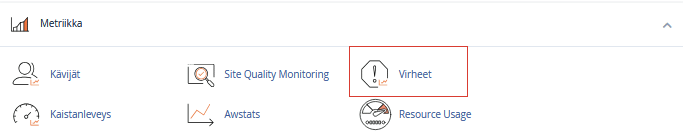 Lokitiedostojen tarkastelu voi olla hyödyllistä mahdollisen vianselvityksen tekemiseksi. Jos sivusto näyttää esimerkiksi ”Internal Server Error” virhettä PHP-muutoksen jälkeen, voit tarkistaa ongelman syyn cPanel-hallintapaneelin Virheet (Errors) työkalun kautta: