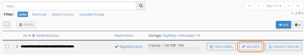 Voit kätevästi muokata sähköpostitilin kiintiötä eli tilankäyttörajaa cPanelissa sähköpostitilien asetuksissa. Näin voit esimerkiksi varmistaa, ettei yksi postilaatikko täyttyessään käytä kaikkea palveluusi kuuluvaa levytilaa ja näin esimerkiksi estä muita sähköpostilaatikkoja vastaanottamasta viestejä.