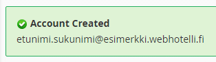 • Ruudulle ilmestyy yllä näkyvä vihreä laatikko, kun tili on luotu onnistuneesti.