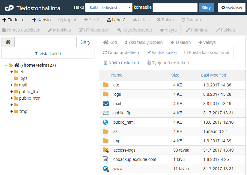 Joskus on tarpeen manuaalisesti muokata, poistaa tai siirtää tiedostoja ja hakemistoja palvelussa. Tämä onnistuu FTP-yhteyden lisäksi myös suoraan cPanelin kautta.