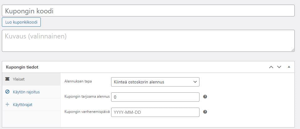 - Kupongin koodi: Anna kupongillesi yksilöllinen koodi. Asiakkaat käyttävät tätä koodia lunastaakseen alennuksen.