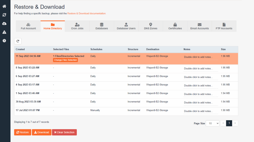 4. Valitse ”Restore”, jos haluat palauttaa suoraan palvelimelle valitsemasi asiat tai ”Download”, jos haluat ladata ne omalle koneellesi.