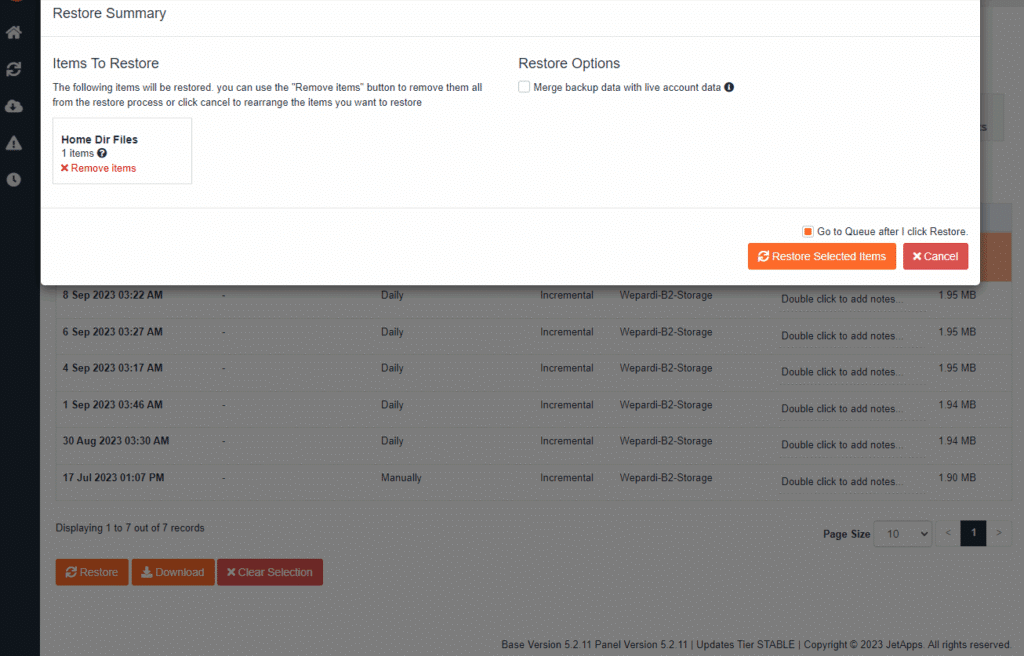 Jos et valitse ”restore options”, niin silloin varmuuskopio palauttaa varmuuskopiossa olevan tiedot ja poistaa nykyiset tiedot hakemistosta.