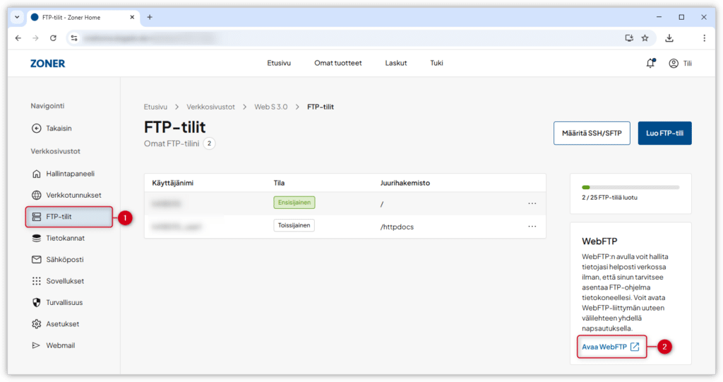 4. Klikkaa vasemmasa valikossa kohtaa FTP-tilit. Klikkaa sitten Avaa WebFTP -linkkiä.
