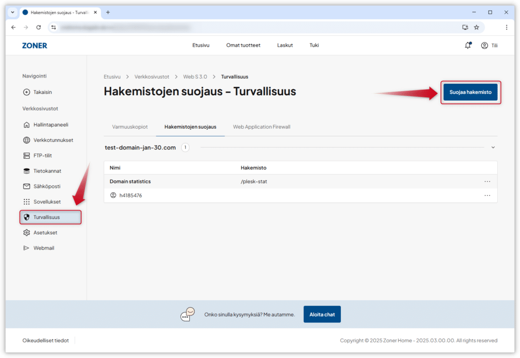 4. Klikkaa vasemmassa valikossa kohtaa Turvallisuus. Turvallisuus-sivulla näet listan kaikista suojatuista hakemistoista.