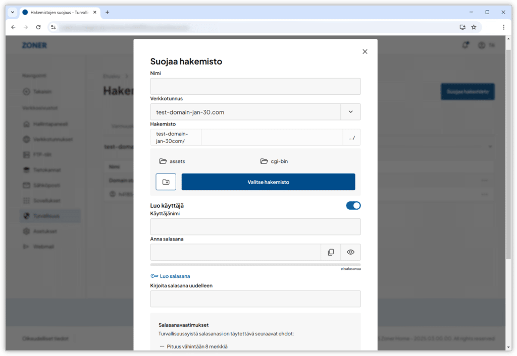 5. Anna ponnahdusikkunassa hakemiston tiedot ja luo tarvittaessa uusi käyttäjä, jolla on oikeudet käyttää kansiota. Klikkaa lopuksi Luo-painiketta.