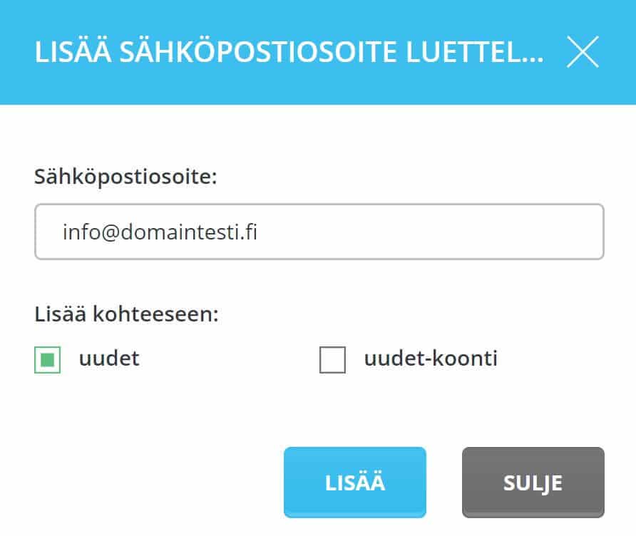Anna lisättävä sähköpostiosoite ja valitse kohde. Tallenna osoite klikkaamalla Lisää.