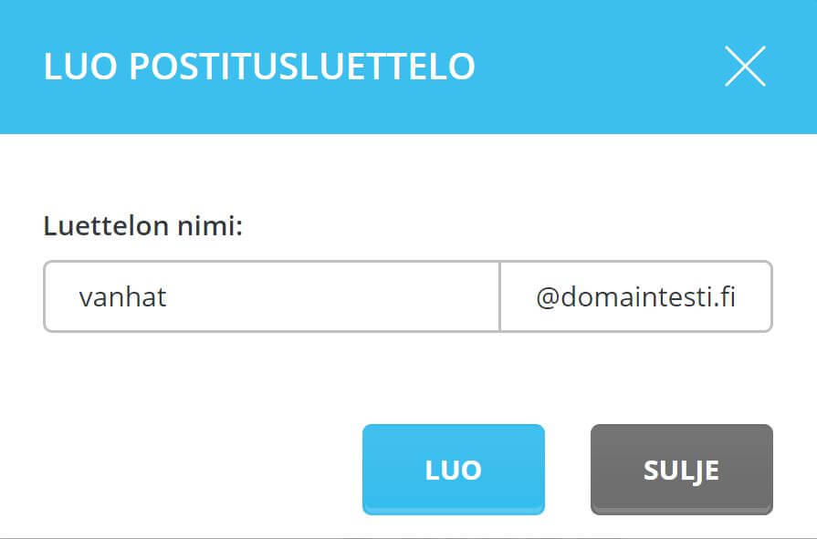 Anna avautuvaan ponnahdusikkunaan postitusluettelolle nimi. Nimi ei saa olla sama kuin mikään käytössä jo oleva sähköpostitili eikä välittäjän (forwarder) tai automaattivastauksen käytössä oleva sähköpostiosoite. Tallenna nimi klikkaamalla Luo.