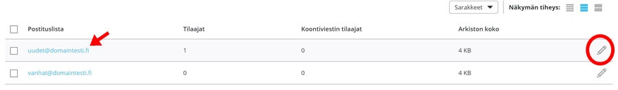 Palaat takaisin Postituslistat-sivulle. Muokkaa listan asetuksia klikkaamalla rivin oikeassa reunassa näkyvää kynä-kuvaketta. Lopuksi tallenna muutokset ja klikkaa Takaisin-painiketta palataksesi Postituslistat-sivulle.